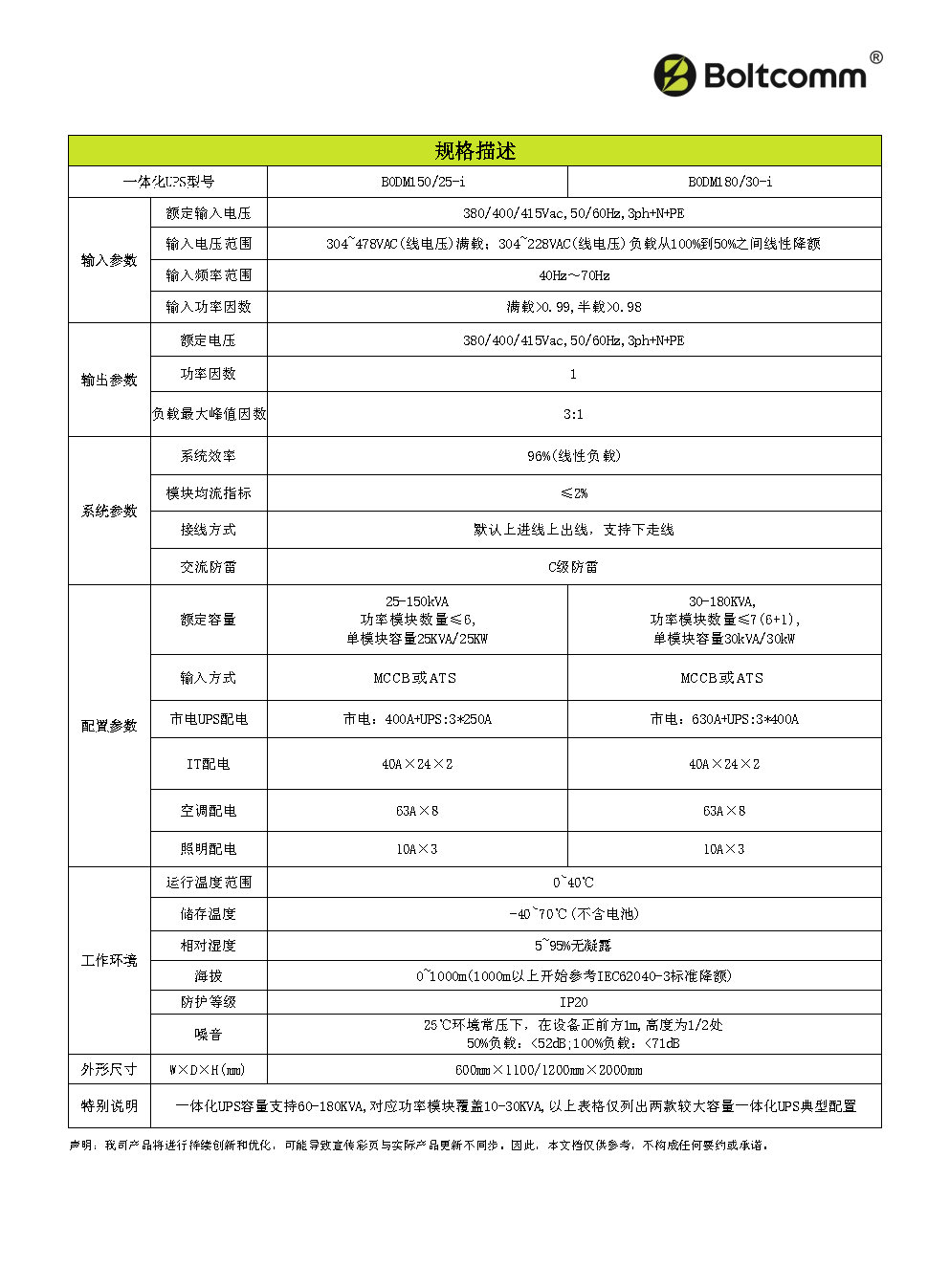 最大支持60~180kVA 一体化UPS 供配电,内置25kW/30kW功率模块。UPS主机、UPS 输入输出柜、精密配电柜,三柜合一, 节约占地68%,节约安装工时55%以上。