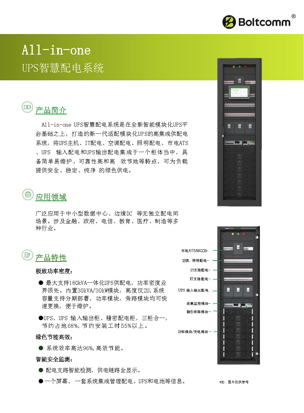 最大支持60~180kVA 一体化UPS 供配电,内置25kW/30kW功率模块。UPS主机、UPS 输入输出柜、精密配电柜,三柜合一, 节约占地68%,节约安装工时55%以上。